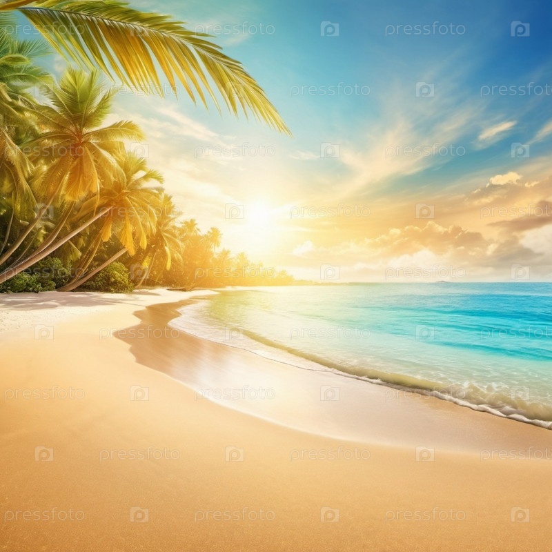 Серена пляжная сцена с нежными волнами, песчаной береговой линией и пальмами, отбрасывающими тени. Яркие цвета и мягкие мазки создают спокойную атмосферу. Генерированный ИИ. Солнечные пляжные каникулы