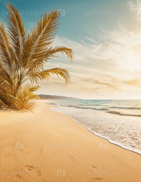 Серена пляжная сцена с нежными волнами, песчаной береговой линией и пальмами, отбрасывающими тени. Яркие цвета и мягкие мазки создают спокойную атмосферу. Генерированный ИИ. Солнечные пляжные каникулы