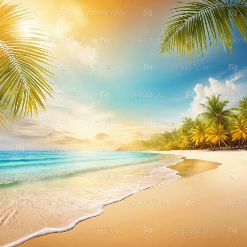 Серена пляжная сцена с нежными волнами, песчаной береговой линией и пальмами, отбрасывающими тени. Яркие цвета и мягкие мазки создают спокойную атмосферу. Генерированный ИИ. Солнечные пляжные каникулы