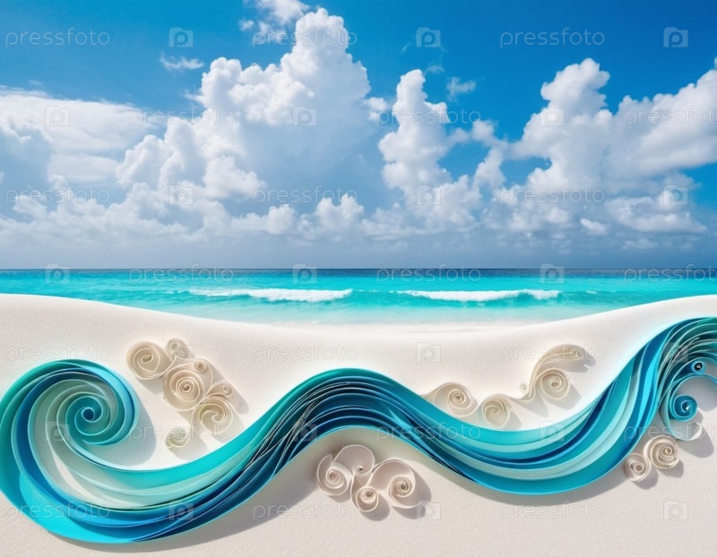 Захватывающий вид на нетронутый пляж с белым песком на Мальдивах. Бирюзовые воды Индийского океана плавно прилегают к берегу, создавая безмятежную идиллическую сцену. Небо ярко-голубое, усеянное пушистыми белыми облаками