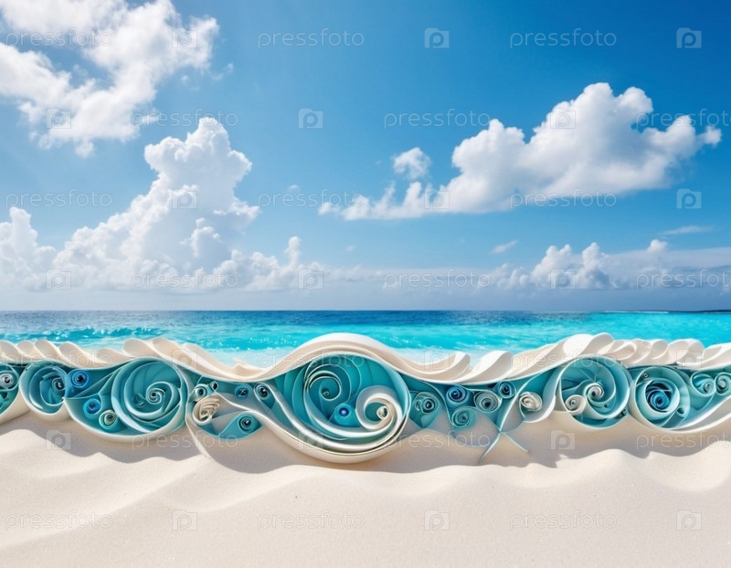Захватывающий вид на нетронутый пляж с белым песком на Мальдивах. Бирюзовые воды Индийского океана плавно прилегают к берегу, создавая безмятежную идиллическую сцену. Небо ярко-голубое, усеянное пушистыми белыми облаками