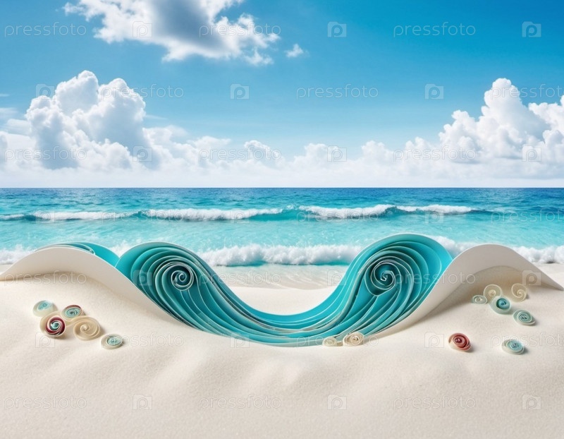 Захватывающий вид на нетронутый пляж с белым песком на Мальдивах. Бирюзовые воды Индийского океана плавно прилегают к берегу, создавая безмятежную идиллическую сцену. Небо ярко-голубое, усеянное пушистыми белыми облаками