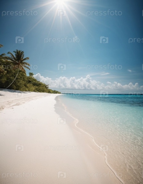 Захватывающий вид на нетронутый пляж с белым песком на Мальдивах. Бирюзовые воды Индийского океана плавно прилегают к берегу, создавая безмятежную идиллическую сцену. Небо ярко-голубое, усеянное пушистыми белыми облаками