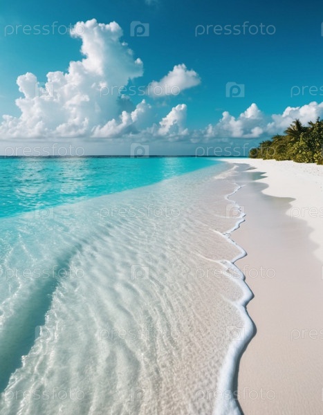 Захватывающий вид на нетронутый пляж с белым песком на Мальдивах. Бирюзовые воды Индийского океана плавно прилегают к берегу, создавая безмятежную идиллическую сцену. Небо ярко-голубое, усеянное пушистыми белыми облаками