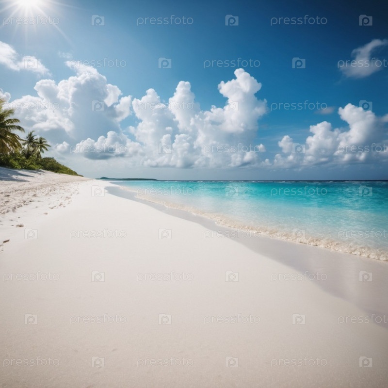 Захватывающий вид на нетронутый пляж с белым песком на Мальдивах. Бирюзовые воды Индийского океана плавно прилегают к берегу, создавая безмятежную идиллическую сцену. Небо ярко-голубое, усеянное пушистыми белыми облаками