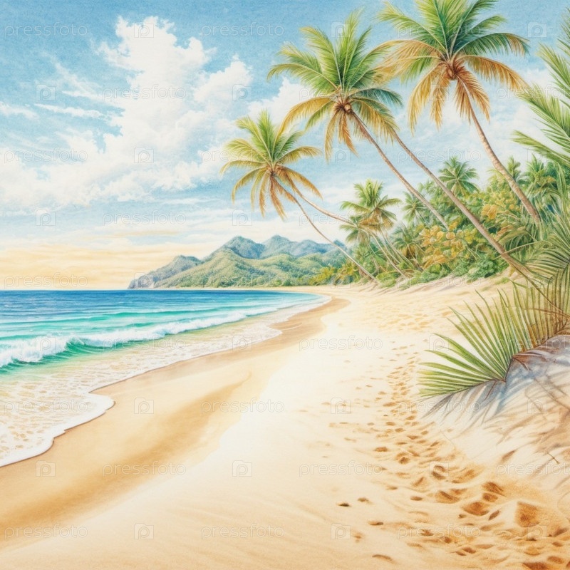 Серена пляжная сцена с нежными волнами, песчаной береговой линией и пальмами, отбрасывающими тени. Яркие цвета и мягкие мазки создают спокойную атмосферу. Генерированный ИИ. Солнечные пляжные каникулы