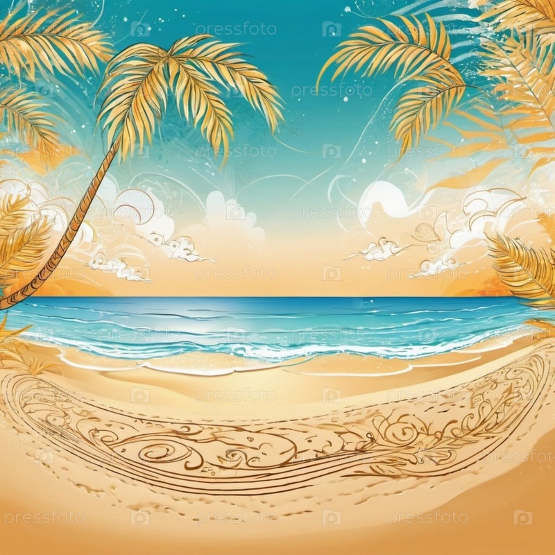 Серена пляжная сцена с нежными волнами, песчаной береговой линией и пальмами, отбрасывающими тени. Яркие цвета и мягкие мазки создают спокойную атмосферу. Генерированный ИИ. Солнечные пляжные каникулы