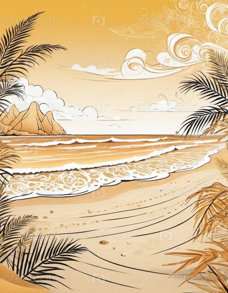 Серена пляжная сцена с нежными волнами, песчаной береговой линией и пальмами, отбрасывающими тени. Яркие цвета и мягкие мазки создают спокойную атмосферу. Генерированный ИИ. Солнечные пляжные каникулы