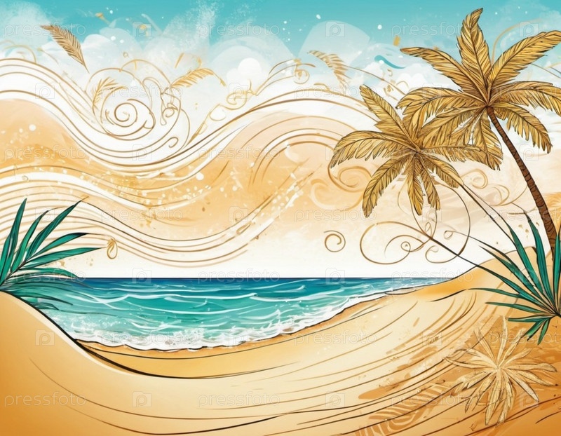 Серена пляжная сцена с нежными волнами, песчаной береговой линией и пальмами, отбрасывающими тени. Яркие цвета и мягкие мазки создают спокойную атмосферу. Генерированный ИИ. Солнечные пляжные каникулы