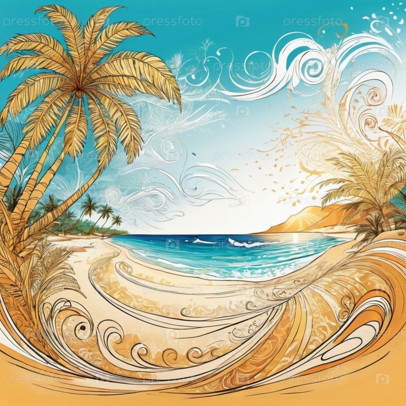 Серена пляжная сцена с нежными волнами, песчаной береговой линией и пальмами, отбрасывающими тени. Яркие цвета и мягкие мазки создают спокойную атмосферу. Генерированный ИИ. Солнечные пляжные каникулы