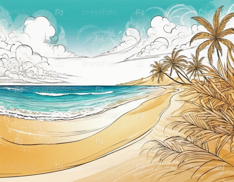 Серена пляжная сцена с нежными волнами, песчаной береговой линией и пальмами, отбрасывающими тени. Яркие цвета и мягкие мазки создают спокойную атмосферу. Генерированный ИИ. Солнечные пляжные каникулы