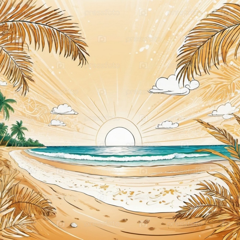 Серена пляжная сцена с нежными волнами, песчаной береговой линией и пальмами, отбрасывающими тени. Яркие цвета и мягкие мазки создают спокойную атмосферу. Генерированный ИИ. Солнечные пляжные каникулы