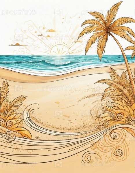 Серена пляжная сцена с нежными волнами, песчаной береговой линией и пальмами, отбрасывающими тени. Яркие цвета и мягкие мазки создают спокойную атмосферу. Генерированный ИИ. Солнечные пляжные каникулы
