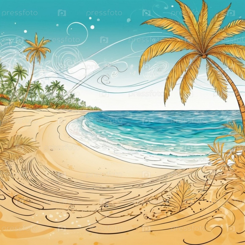 Серена пляжная сцена с нежными волнами, песчаной береговой линией и пальмами, отбрасывающими тени. Яркие цвета и мягкие мазки создают спокойную атмосферу. Генерированный ИИ. Солнечные пляжные каникулы