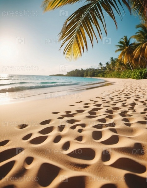 Серена пляжная сцена с нежными волнами, песчаной береговой линией и пальмами, отбрасывающими тени. Яркие цвета и мягкие мазки создают спокойную атмосферу. Генерированный ИИ. Солнечные пляжные каникулы
