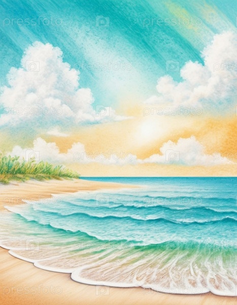 Художественная пляжная сцена с нежными волнами, песчаная береговая линия. Яркие цвета создают мирную атмосферу. Генерированный ИИ. Концепция путешествий на солнечный пляж. Копируйте пространство. Солнечный тропический рай. На заднем плане