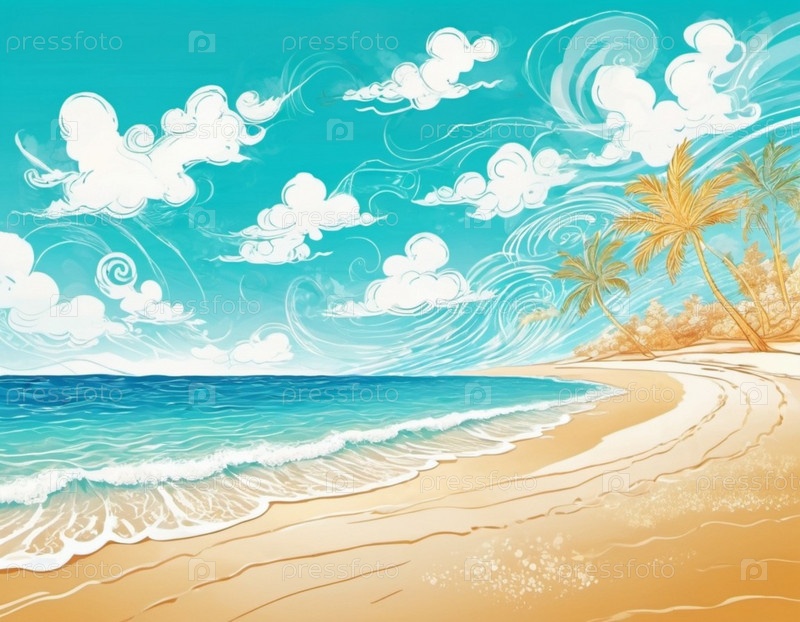Художественная пляжная сцена с нежными волнами, песчаная береговая линия. Яркие цвета создают мирную атмосферу. Генерированный ИИ. Концепция путешествий на солнечный пляж. Копируйте пространство. Солнечный тропический рай. Взрывной фон
