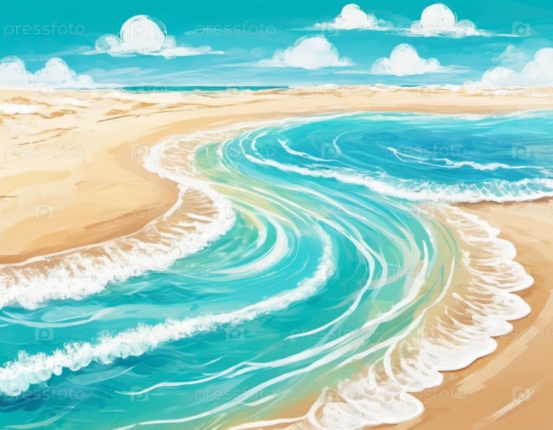 Художественная пляжная сцена с нежными волнами, песчаная береговая линия. Яркие цвета создают мирную атмосферу. Генерированный ИИ. Концепция путешествий на солнечный пляж. Копируйте пространство. Солнечный тропический рай. Взрывной фон