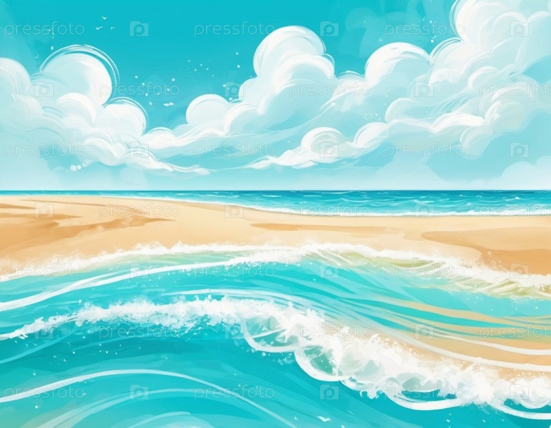Художественная пляжная сцена с нежными волнами, песчаная береговая линия. Яркие цвета создают мирную атмосферу. Генерированный ИИ. Концепция путешествий на солнечный пляж. Копируйте пространство. Солнечный тропический рай. Взрывной фон