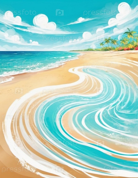 Художественная пляжная сцена с нежными волнами, песчаная береговая линия. Яркие цвета создают мирную атмосферу. Генерированный ИИ. Концепция путешествий на солнечный пляж. Копируйте пространство. Солнечный тропический рай. На заднем плане