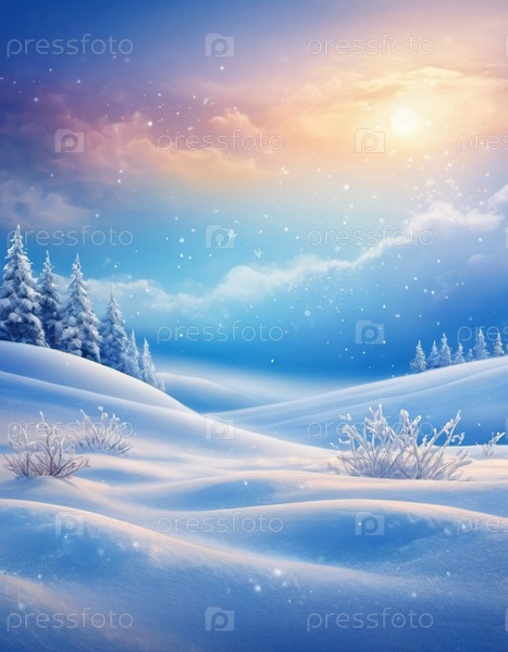 Живописная зимняя сцена с заснеженной равниной и деревьями, вытянутыми на яркое закатное небо. Нежный снегопад добавляет волшебное прикосновение, создавая спокойный и захватывающий пейзаж. Генерированный ИИ