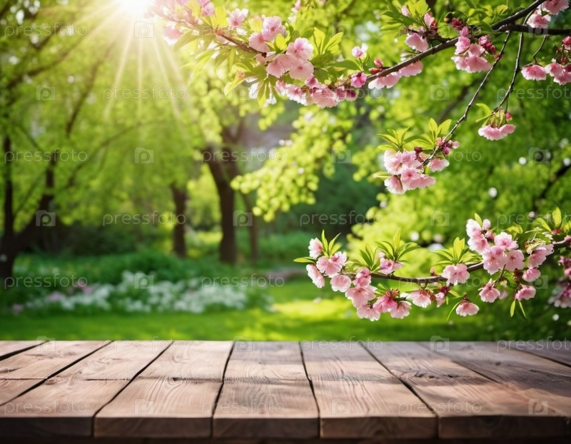 Деревянный стол сидит перед размытым фоном весеннего сада. Розовые цветы сакуры на ветке достигают солнца, которое светит сквозь листву. Копирование пространства для демонстрации продукции. ИИ