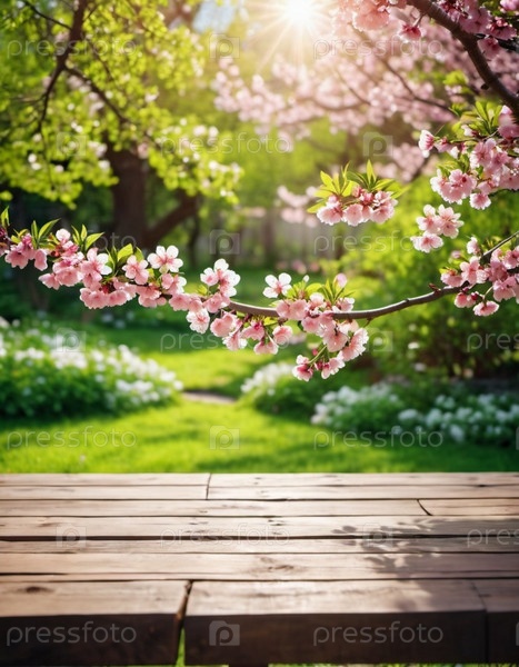 Деревянный стол сидит перед размытым фоном весеннего сада. Цветы на ветке достигают солнца, которое ярко светит сквозь листву. Копирование пространства для демонстрации продукции. ИИ