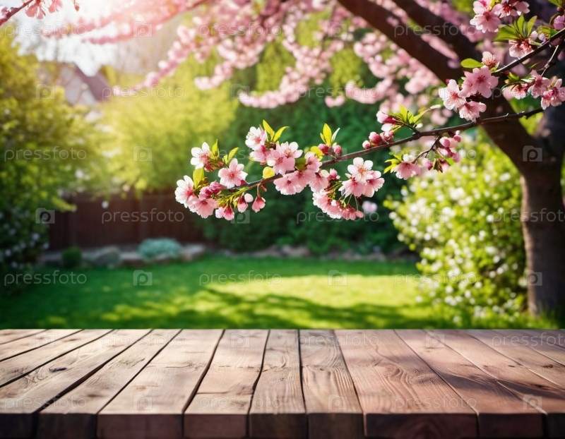 Деревянный стол сидит перед размытым фоном весеннего сада. Цветы на ветке достигают солнца, которое ярко светит сквозь листву. Копирование пространства для демонстрации продукции. ИИ