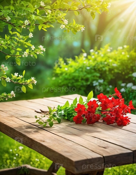 Деревянный стол сидит перед размытым фоном весеннего сада. Цветы на ветке достигают солнца, которое ярко светит сквозь листву. Копирование пространства для демонстрации продукции. ИИ