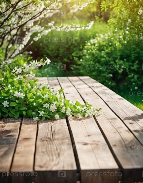 Деревянный стол сидит перед размытым фоном весеннего сада. Цветы на ветке достигают солнца, которое ярко светит сквозь листву. Копирование пространства для демонстрации продукции. ИИ