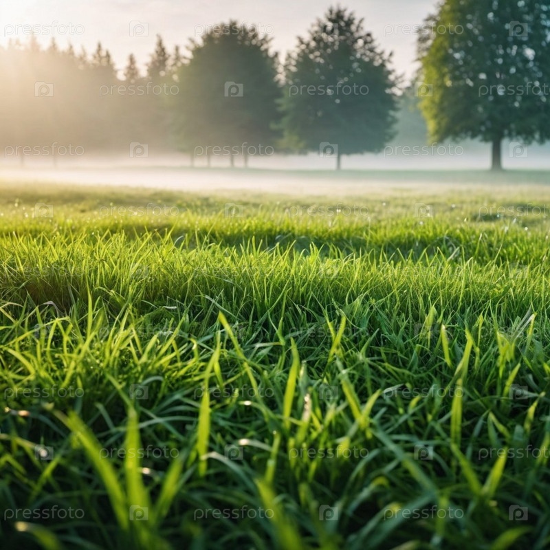 Зеленое травяное поле. Туманное утро с солнцем, сияющим сквозь туман на летнем лесном фоне. Деревья вдалеке размыты и создают ощущение спокойствия и миролюбия. Генерированный ИИ
