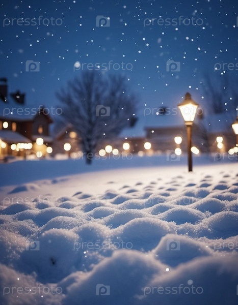 Милый рождественский ночной пейзаж, покрытый свежим снегом. Прекрасная зимняя деревня. Новогодняя рождественская атмосфера. Праздничная очаровательная зимняя страна чудес. Снежинки, сугробы и холмы. генерируемый