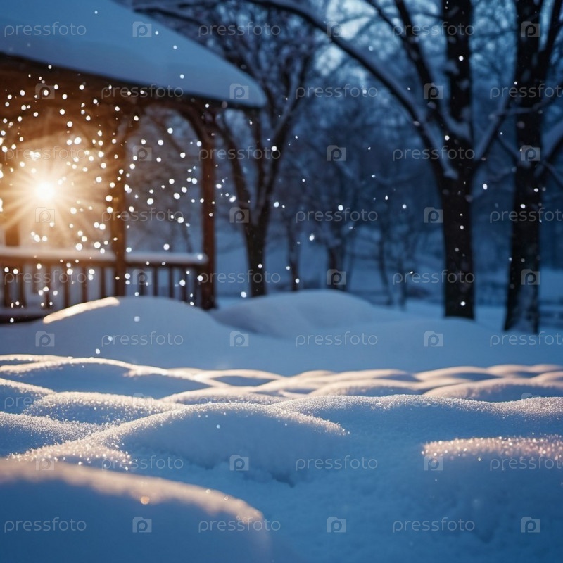 Милый рождественский ночной пейзаж, покрытый свежим снегом. Прекрасная зимняя деревня. Новогодняя рождественская атмосфера. Праздничная очаровательная зимняя страна чудес. Снежинки, сугробы и холмы. Сгенерированный ИИ