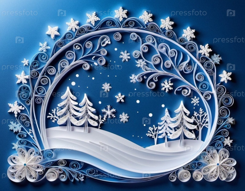 Бумажные перфорационные работы, изображающие зимнюю сцену. В произведении представлены белые бумажные кудряшки, расположенные для формирования снежного ландшафта с деревьями, сугробами и декоративными снежинками. Копируйте пространство. генерируемый