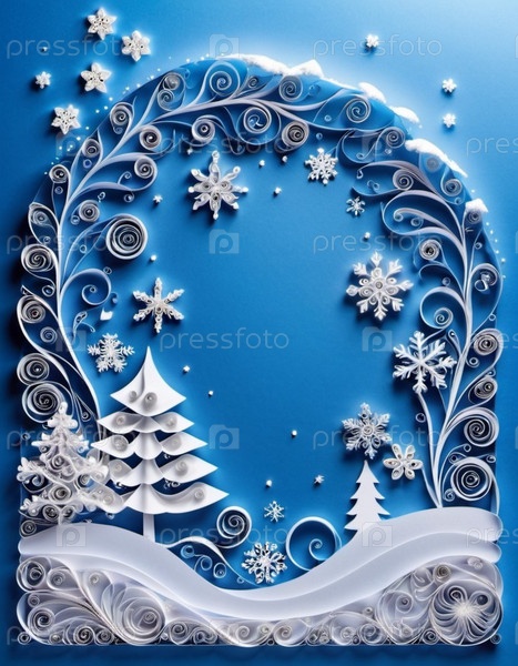 Бумажные перфорационные работы, изображающие зимнюю сцену. В произведении представлены белые бумажные кудряшки, расположенные для формирования снежного ландшафта с деревьями, сугробами и декоративными снежинками. Копируйте пространство. генерируемый