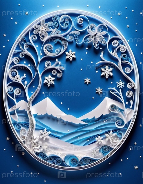 Бумажные перфорационные работы, изображающие зимнюю сцену. В произведении представлены белые бумажные кудряшки, расположенные для формирования снежного ландшафта с деревьями, сугробами и декоративными снежинками. Копируйте пространство. генерируемый