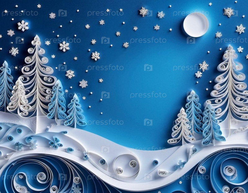 Бумажные перфорационные работы, изображающие зимнюю сцену. В произведении представлены белые бумажные кудряшки, расположенные для формирования снежного ландшафта с деревьями, сугробами и декоративными снежинками. Копируйте пространство. генерируемый