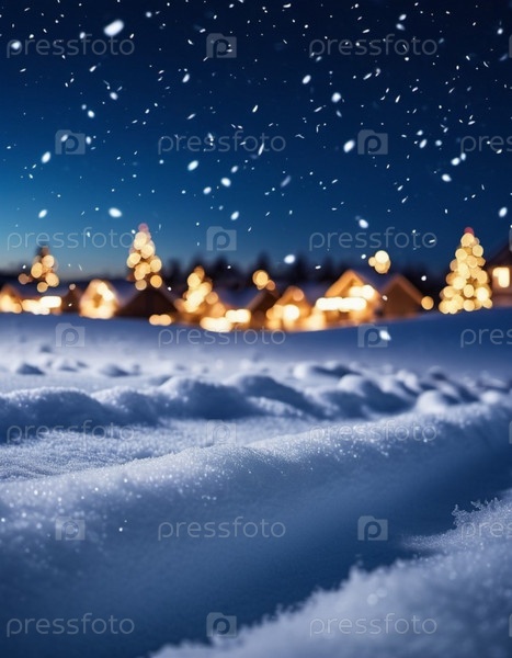 Милый рождественский ночной пейзаж, покрытый свежим снегом. Прекрасная зимняя деревня. Новогодняя рождественская атмосфера. Праздничная очаровательная зимняя страна чудес. Снежинки, сугробы и холмы. генерируемый