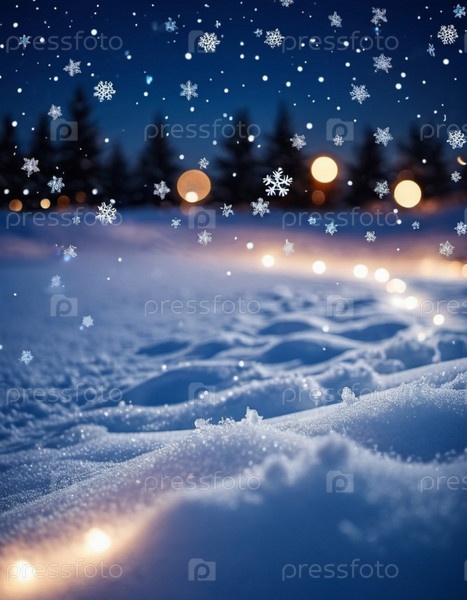 Милый рождественский ночной пейзаж, покрытый свежим снегом. Прекрасная зимняя деревня. Новогодняя рождественская атмосфера. Праздничная очаровательная зимняя страна чудес. Снежинки, сугробы и холмы. генерируемый