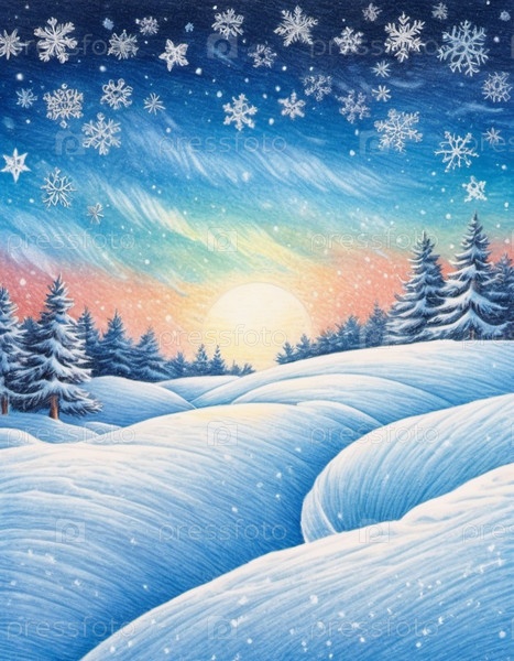 Живописная зимняя сцена с заснеженной равниной и деревьями, вытянутыми на ярком ночном небе. Нежный снегопад добавляет волшебное прикосновение, создавая спокойный и захватывающий пейзаж. Генерированный ИИ