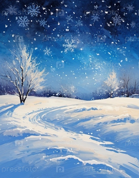 Живописная зимняя сцена с заснеженной равниной и деревьями, вытянутыми на ярком ночном небе. Нежный снегопад добавляет волшебное прикосновение, создавая спокойный и захватывающий пейзаж. Генерированный ИИ