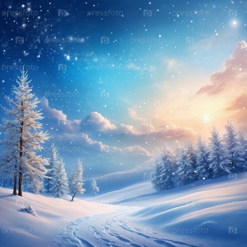 Живописная зимняя сцена с заснеженной равниной и деревьями, вытянутыми на ярком ночном небе. Нежный снегопад добавляет волшебное прикосновение, создавая спокойный и захватывающий пейзаж. Генерированный ИИ