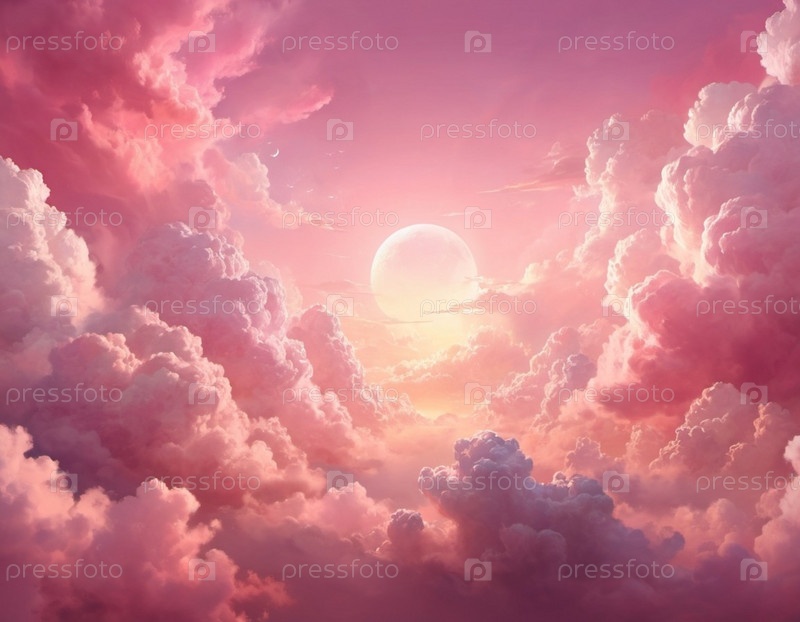 Красивые розовые пушистые облака в ярком закатном небе. Визуальный дисплей. Драматические нереальные небеса с кучевыми и стратовыми облаками в атмосфере. Неизвестная планета с розовыми облаками Луна, планеты и звезды. Искусство