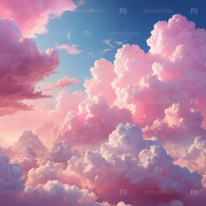 Прекрасный вид на розовые облака в ярком закате неба. Облака пушистые и полны света, создавая потрясающий визуальный дисплей. Драматические нереальные небеса с кучевыми и стратовыми облаками в атмосфере. искусство
