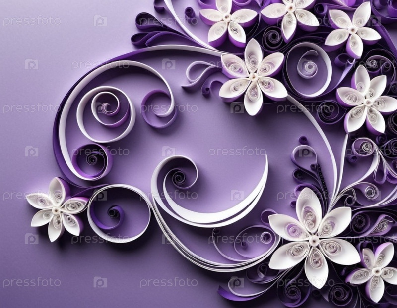 Бумажные цветы, изготовленные с использованием техники quilling. Цветы находятся в оттенках фиолетового и белого и расположены по кругу на фоне лаванды. Каркас с пространством для копирования. генерируемый