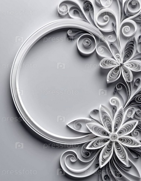 Бумажные цветы, изготовленные с использованием техники quilling. Цветы находятся в оттенках серого и белого и расположены по кругу на сером фоне. Каркас с пространством для копирования. генерируемый