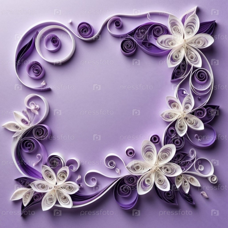 Бумажные цветы, изготовленные с использованием техники quilling. Цветы находятся в оттенках фиолетового и белого и расположены по кругу на фоне лаванды. Каркас с пространством для копирования. генерируемый