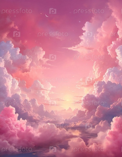 Прекрасный вид на розовые облака в ярком закате неба. Облака пушистые и полны света, создавая потрясающий визуальный дисплей. Драматические нереальные небеса с кучевыми и стратовыми облаками в атмосфере. искусство