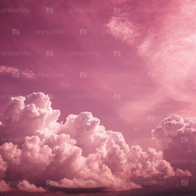 Прекрасный вид на розовые облака в ярком закате неба. Облака пушистые и полны света, создавая потрясающий визуальный дисплей. Драматические нереальные небеса с кучевыми и стратовыми облаками в атмосфере. искусство