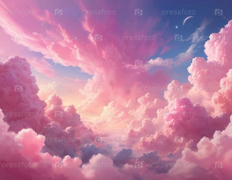 Прекрасный вид на розовые облака в ярком закате неба. Облака пушистые и полны света, создавая потрясающий визуальный дисплей. Драматические нереальные небеса с кучевыми и стратовыми облаками в атмосфере. искусство